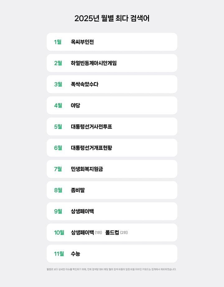 정치와 거시 경제 이슈도 검색량 변동으로 또렷하게 드러났다. 5월부터 6월까지는 탄핵 선고 이후 치러진 제21대 대선을 둘러싼 관심이 검색 상위권을 장기간 점유했다. 야당 등 정치 키워드가 반복적으로 상위권에 등장하면서 굵직한 정치 일정을 앞둔 시기에 디지털 공간의 여론 관심도가 어떻게 집중되는지 보여줬다. 7월과 9월에는 민생회복지원금과 상생페이백 정책이 최다 검색어로 부상했다. 지급 기준, 신청 절차, 일정 등을 확인하려는 검색 수요가 폭증한 결과다. 11월에는 대학수학능력시험이 검색 1위를 차지해 교육·입시 일정 역시 검색 패턴과 맞물려 움직이는 양상이 재확인됐다.