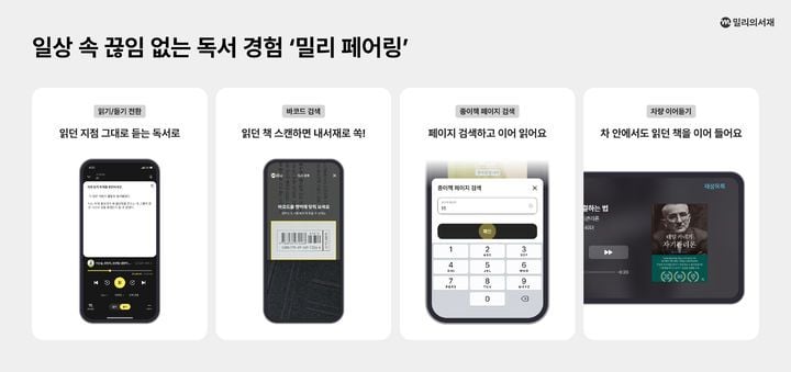 밀리 페어링의 기술적 핵심은 기기간·포맷간 실시간 동기화 및 연동 구현에 있다. 구독자는 출퇴근길 차량에서는 오디오북, 집에서는 전자책, 여유 시간 종이책 등 다양한 상황 변화에 따라 기기나 형태에 관계 없이 이어서 읽거나 들을 수 있다. 독자가 전자책에서 오디오북으로 전환하면 그 지점이 자동으로 동기화되고, 종이책에 포함된 바코드를 스캔하면 스마트폰에서 바로 이어서 읽을 수 있는 사용자 중심 기능이 적용됐다. 특히 모바일, 태블릿, 차량 인포테인먼트, 블루투스 오디오 등 다양한 디바이스 환경 간 연동성을 갖춘 점이 기존 단일 포맷 중심 독서 서비스와 차별화된다.
