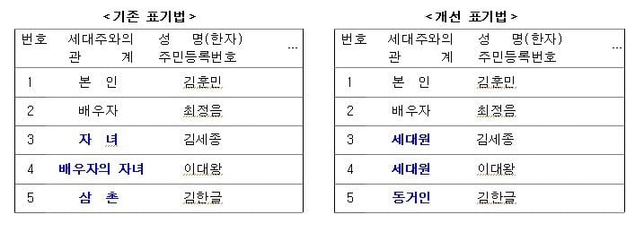 주요 개정 내용에 따르면, 이제까지 세대주 기준의 가족관계가 등·초본에 상세하게 기록돼 재혼 이후 '배우자의 자녀' 등 표기가 남아 사생활이 노출된다는 비판이 많았다. 행정안전부는 앞으로 세대주의 배우자를 제외한 가족(부모, 조부모, 형제자매 등)은 모두 '세대원'으로 표기하고, 그 외는 '동거인'으로 기록하기로 했다. 이러한 변경으로 이혼이나 재혼 사실이 서류상 드러나지 않도록 개선된다. 특히, 배우자의 자녀의 경우 기존에는 재혼 사실이 공개됐으나, 앞으로는 '세대원'이라는 단순 표기로 바뀐다.