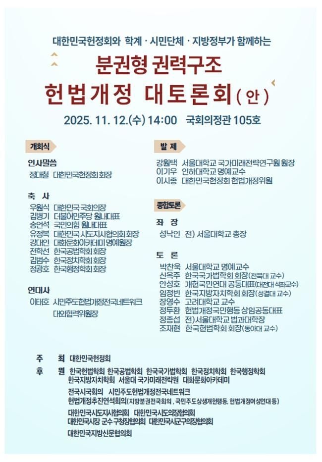 행사는 대한민국시도지사협의회, 대한민국시도의장협의회 등이 후원한다. 정치권은 이번 논의가 향후 개헌론의 촉진제로 작용할지 주목하는 분위기다.