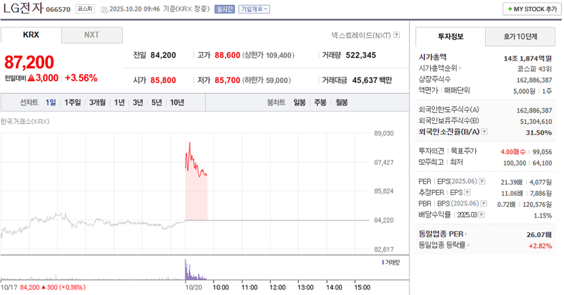 “LG전자 장중 3.56% 급등”…외국인 매수세에 87,200원 상회