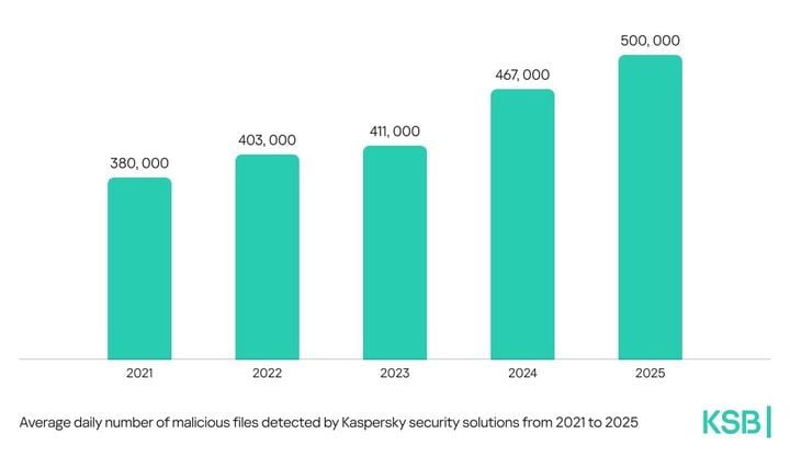 카스퍼스키는 31일 공개한 연례 보안 보고서를 통해 올해 자사 보안 솔루션이 일평균 50만개의 악성 파일을 발견했다고 밝혔다. 지난해보다 7프로 늘어난 수치다. 카스퍼스키의 탐지 통계는 자사 엔드포인트 보안 제품과 클라우드 기반 위협 인텔리전스 네트워크를 통해 수집된 악성코드 샘플과 공격 시도를 기반으로 집계된다. 보고서는 악성코드 유형별 탐지 추세, 운영체제별 공격 양상, 지역별 위협 특성을 종합 분석했다.