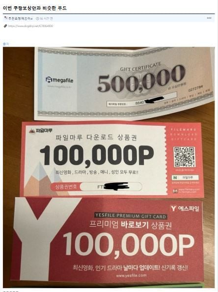 31일 주요 온라인 커뮤니티에는 쿠팡의 개인정보 유출 보상안을 풍자하는 게시글들이 잇따라 올라왔다. 한 이용자는 고액 포인트가 적힌 상품권 사진 여러 장을 올리며 이번 보상 구조를 "겉으로는 큰 혜택을 내건 미끼 상품권과 다를 바 없다"고 꼬집었다. 액면가는 크지만 실제로 쓸 수 있는 조건이 극도로 제한되고, 사용하려면 추가 결제나 계정 등록이 필요해 체감 가치는 낮다는 점이 쿠팡 보상 방식과 닮았다는 주장이다.