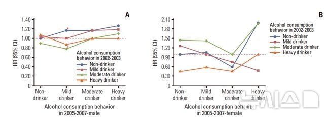 연구팀이 하루 알코올 섭취량(남성 기준 경도 15g 미만, 중등도 15~29.9g, 고용량 30g 이상)에 따라 그룹을 분류해 분석한 결과, 기존 음주 습관의 유지 여부와 별개로 음주량이 늘어나는 경우 위암 위험이 명백히 증가했다. 특히 평소 음주를 하지 않던 이가 '가벼운 한 잔'을 시작할 경우에도 위암 발생률이 14% 높아졌으며(상대위험도 1.14), 반대로 중등도 음주자가 섭취량을 줄이면 위험이 20% 가까이 감소(상대위험도 0.80)하는 등 생활습관 변화가 질병 위험에 직접 연결되는 양상이 뚜렷했다.
