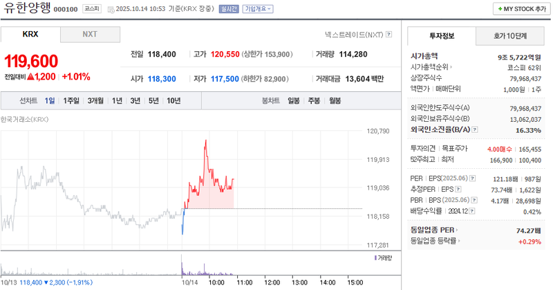 14일 오전 10시 53분 기준, 유한양행은 전 거래일 종가 118,400원보다 1,200원 높은 119,600원에 거래됐다. 시초가는 118,300원이었으며, 장중 최저 117,500원에서 최고 120,550원까지 3,050원의 비교적 뚜렷한 가격 변동폭을 보였다. 거래량은 114,280주, 거래대금은 136억 400만 원으로 집계돼 거래 활기가 이어지는 모습이다.