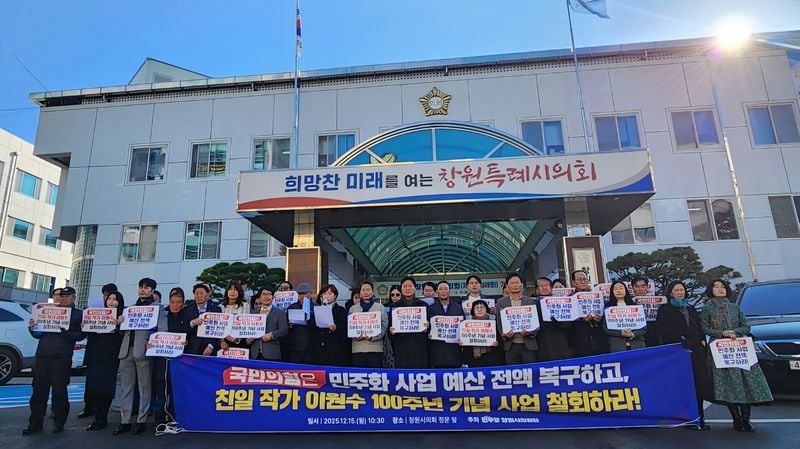 창원시의회 더불어민주당 시의원단은 15일 창원시의회 앞에서 기자회견을 열고 상임위원회와 예산결산특별위원회 심의 과정에서 민주화 사업 관련 예산이 국민의힘 의원들의 주도로 삭감됐다고 주장했다. 이들은 예산 심사 절차를 거치며 민주화 사업이 후순위로 밀려났다고 보고 정치적 의도가 깔려 있다고 의심했다.