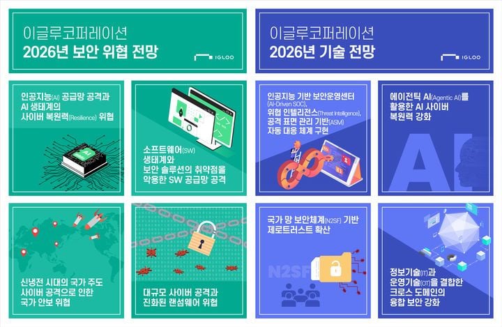 이글루코퍼레이션은 이런 내용을 담은 2026년 사이버 보안 위협 및 기술 전망 보고서를 발표했다. 회사 보안분석팀은 내년을 전후해 등장할 핵심 위협으로 AI 및 SW 공급망 공격, 국가주의 경쟁 심화에 따른 지능형 해킹과 사이버 무기화, 랜섬웨어 조직의 서비스형 공격 구조 등을 지목했다. 분석팀은 2026년을 기점으로 사이버 보안 환경이 기술 발전 속도보다 공격 진화 속도가 더 빠른 양상으로 재편될 수 있다고 봤다.