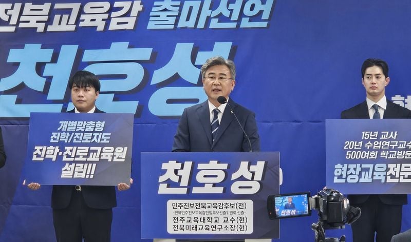 교육개혁 요구와 현 교육행정 불신이 맞물리며 전북교육감 선거전이 달아오르고 있다. 천호성 전주교육대학교 교수가 내년 지방선거를 앞두고 세 번째 도전에 나서며 교육 대전환을 전면에 내세웠다.