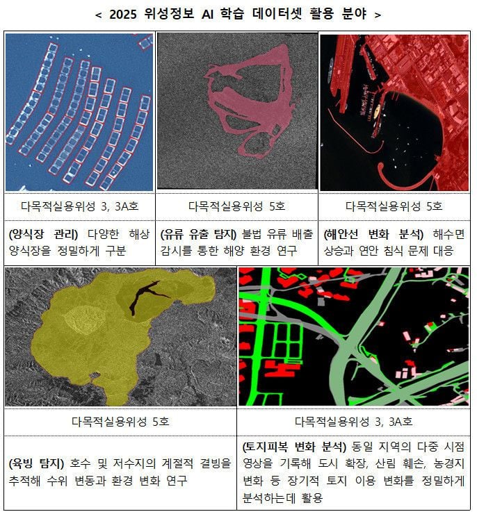 우주항공청이 주관하는 ‘위성정보 빅데이터 활용지원체계 개발사업’은 2023년부터 다목적실용위성 3호, 3A호, 5호 등에서 수집한 위성 영상을 활용, 전국 단위로 체계적인 AI 학습 데이터셋을 만들어왔다. 올해 공개된 15만건 규모 데이터셋에는 6종 해양 데이터(양식장, 유류 유출, 해안선, 선박, 육빙, 해빙)와 토지피복 시계열 변화 정보가 포함됐다. 해당 데이터는 해역 내 오염 감시, 불법 어업 탐지, 연안 지도 자동 갱신 등에 활용되며, 토지피복 변화는 도심화 추이 분석과 국토계획 연구 기반이 된다.