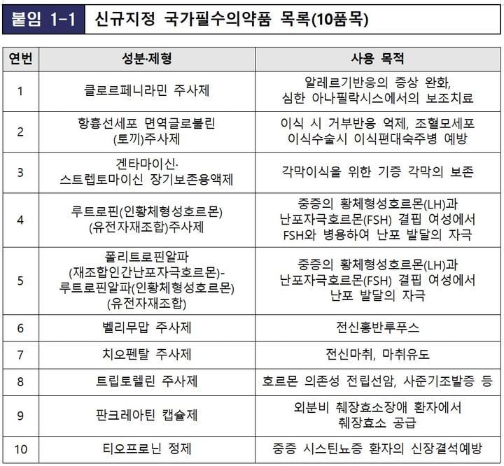 식품의약품안전처는 26일 국가필수의약품 안정공급 협의회 정기회의를 열고 난임치료제와 마취제, 면역억제 보조치료제 등 10개 품목을 국가필수의약품으로 신규 지정했다고 27일 밝혔다. 신규 지정 품목에는 난임 시술 시 난포 발달을 자극하는 데 사용하는 루트로핀 주사제를 비롯해, 면역억제가 필요한 응급상황에서 보조치료 목적으로 사용하는 클로르페니라민 주사제, 전신마취 시 적용가능 범위가 넓은 치오펜탈 주사제가 포함됐다. 식약처는 이들 품목을 안정공급 지원 필요성이 높은 의약품으로 분류했다.