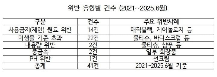 화장품 산업 내 안전관리 허점이 드러나고 있다. 최근 5년간 화장품 안전기준 위반 사례가 총 41건 적발된 것으로 나타났으며, 일부 제조업체의 반복 위반 사례가 수년째 되풀이되는 현실이 지적받고 있다. 2021년부터 2025년 6월까지 식품의약품안전처가 국회 보건복지위원회 소속 소병훈 더불어민주당 의원실에 제출한 ‘화장품 안전기준 위반 내역’에 따르면, 가장 빈번한 위반 유형은 사용금지 또는 제한된 원료 사용(14건)으로 나타났다. 미생물, 중금속·불순물 및 내용량 기준 위반 등 기타 사례는 27건에 달했다.