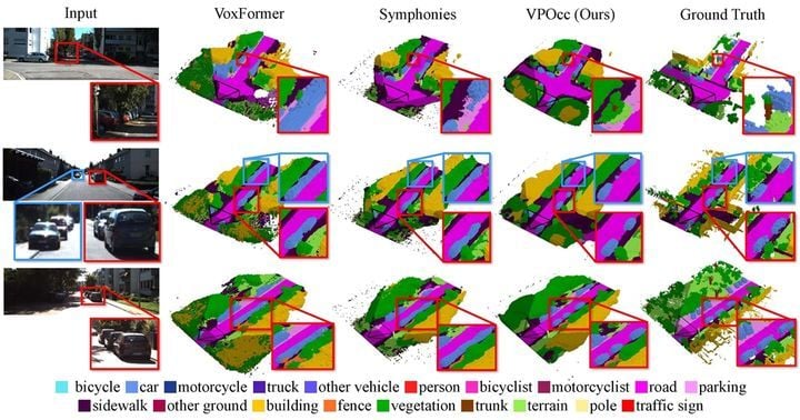 새 모델은 크게 세 부분으로 구성된다. VPZoomer는 소실점에 따라 자료를 재배열해 원근 왜곡을 최소화하며, VPCA는 멀고 가까운 영역의 정보 수집을 균형 있게 한다. 마지막 SVF 모듈은 원본과 보정 이미지의 정보를 통합, 전반적인 인식 성능을 최대화했다. 실험 결과 VPOcc는 기존 벤치마크 대비 공간 이해 지표(mIoU)·복원 정확도(IoU) 모두 탁월한 수치를 기록했고, 특히 자율주행차에서 중요한 도로상의 먼 사물과 겹친 객체들을 기존 방식보다 선명하고 명확하게 판별했다.
