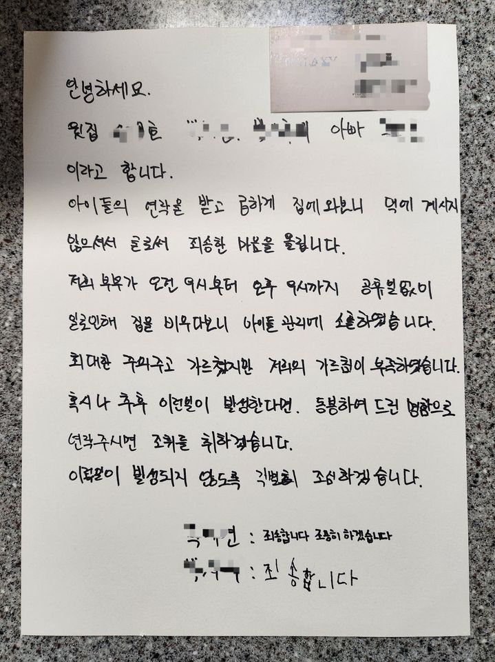 25일 온라인 커뮤니티에 올라온 한 사례는 전통적 방식의 갈등 해결을 보여준다. 자영업을 하는 아버지는 가게에서 일하던 중 자녀로부터 “아랫집 할머니가 소음 문제로 찾아왔다”는 연락을 받고 곧장 집으로 돌아왔다. 평소 층간소음 방지 슬리퍼를 신기며 주의를 줬지만, 아이들만 있던 사이 소파에서 뛰는 등의 행동이 문제를 일으킨 것으로 파악됐다. 그는 준비한 음식과 함께 아랫집을 찾았으나 부재중이어서, 대신 자신의 잘못을 명확히 인정하는 반성문을 손글씨로 작성했다.