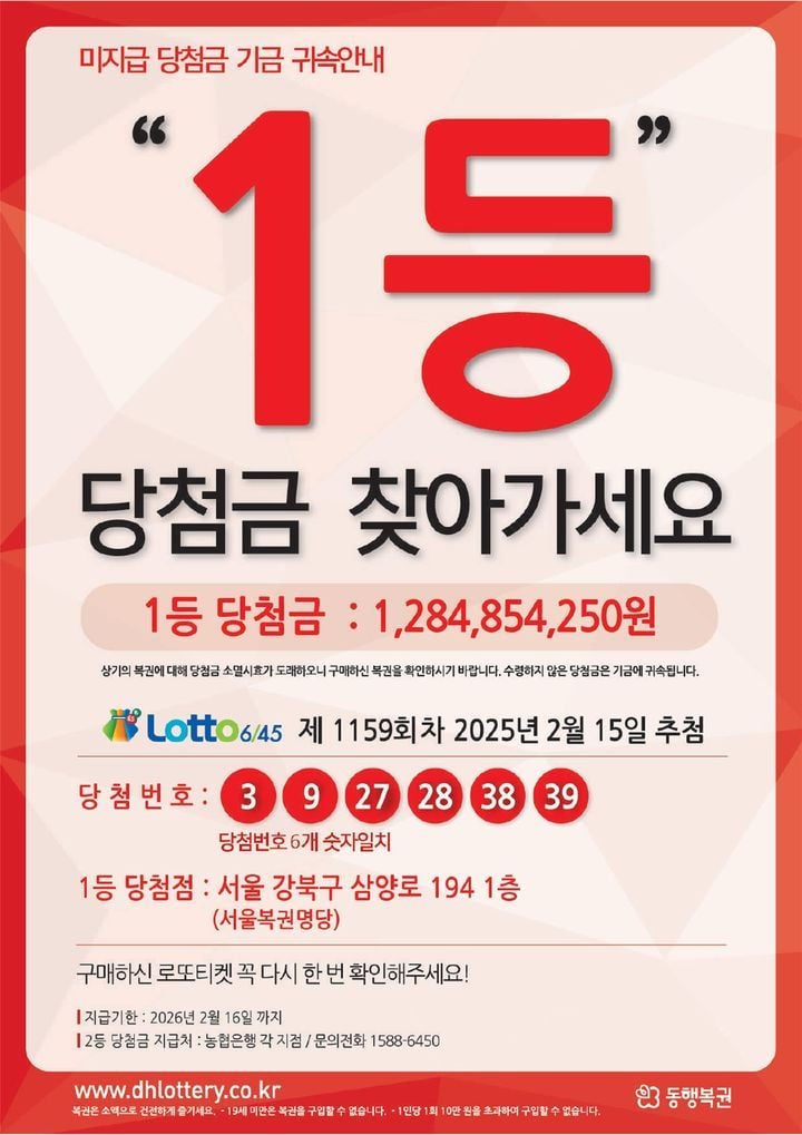 동행복권에 따르면 지난 2월 15일 추첨한 제1159회 로또복권 1등과 2등 당첨금 가운데 각각 1건씩이 아직 수령되지 않았다. 미수령 1등 당첨금은 12억8485만원으로 당첨번호는 3, 9, 27, 28, 38, 39이며 서울 강북구의 한 판매점에서 판매됐다. 같은 회차 2등 미수령 당첨금은 4477만원으로, 1등 번호 6개와 보너스 번호 7을 모두 맞힌 복권으로 경북 김천시 소재 판매점에서 구매된 것으로 파악됐다. 지급 기한은 추첨 다음 해인 2026년 2월 16일까지다.