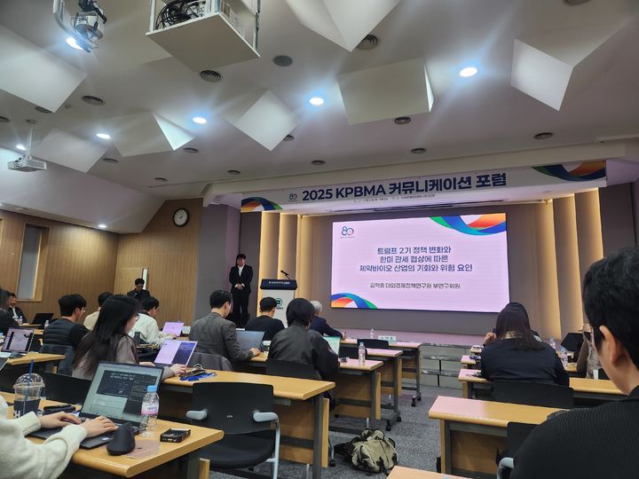 첫 발표에서 김혁중 대외경제정책연구원 부연구위원은 트럼프 2기 정책 변화와 한미 관세 협상이 제약바이오 산업에 미칠 영향을 분석했다. 그는 제약바이오 관세 정책의 세부 윤곽은 아직 나오지 않았지만, 전반적으로 관세율이 현실적인 수준으로 조정되는 방향으로 논의가 진행되고 있다고 설명했다. 미국이 지난 4월 개시한 무역확장법 232조 검토 일정에 따라 늦으면 내년 4월 말 무렵 제약바이오 제품에도 새로운 관세율이 부과될 수 있다는 전망을 내놨다.