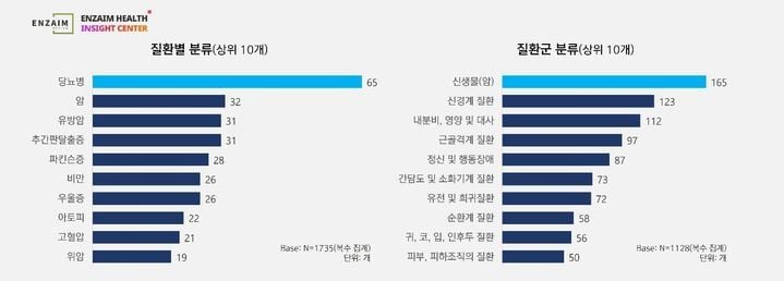질환별로는 당뇨병 관련 환자단체가 65개로 가장 많았다. 암(32개), 유방암(31개), 추간판탈출증(31개), 파킨슨병(28개) 단체가 뒤를 이었으며, 질환군 분류에서는 신생물(암) 관련 단체가 165개로 1위, 신경계질환(123개), 내분비·영양·대사질환(112개) 순을 보였다.