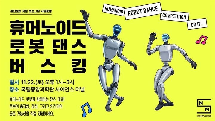 국립중앙과학관은 22일 오후 1시 대전 본관 내 사이언스 터널에서 휴머노이드 로봇과 관람객이 함께 참여하는 휴머노이드 로봇 댄스 버스킹 행사를 연다고 21일 밝혔다. 이번 행사는 사람과 비슷한 관절 구조와 동작을 구현하는 인간형 로봇을 활용해, 관람객이 로봇과 함께 뛰고 춤추며 복싱 동작을 체험할 수 있도록 구성됐다. 단순 시연 관람을 넘어, 관람객이 직접 로봇을 조종해보는 참여형 프로그램을 포함한 것이 특징이다.