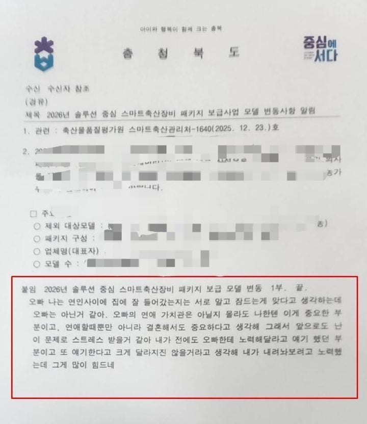 문제가 된 공문은 23일 충청북도가 도내 시군 축산 담당 부서에 발송한 2026년 솔루션 중심 스마트 축산장비 패키지 보급 사업 모델 변동 사항 알림 문서다. 도지사 직인이 찍힌 공식 공문으로, 통상 예산 편성·사업 일정·장비 사양 등의 실무 정보가 담기는 유형이다. 그러나 해당 문서의 붙임 파일 하단에 연인 사이 대화로 보이는 장문의 개인 메시지가 함께 포함돼 배포된 사실이 26일 온라인 커뮤니티 등을 통해 알려지면서 논란이 커졌다.