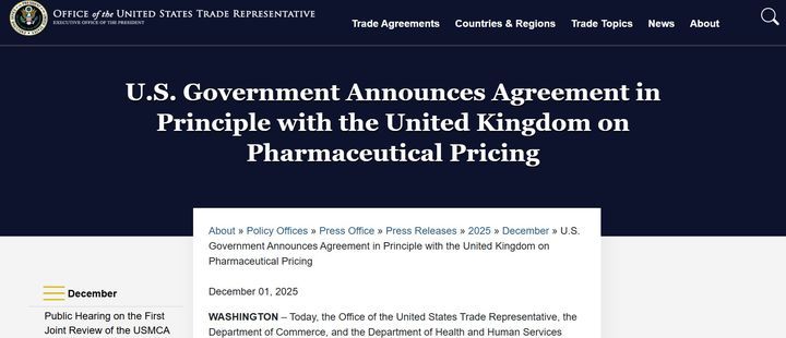 미국 무역대표부에 따르면 양국은 1일 영국이 미국으로 수출하는 의약품과 의약품 원료, 의료 기술에 대한 관세를 전면 철폐하기로 합의했다. 당초 미국은 무역확장법 232조를 근거로 영국산 의약품에 최대 100퍼센트 관세를 부과하겠다고 경고했으나, 최종적으로 0퍼센트 관세로 선회했다. 동시에 영국의 공공 약가 정책을 무역법 301조 조사 대상에서 제외해 향후 통상 압박을 완화하기로 했다.