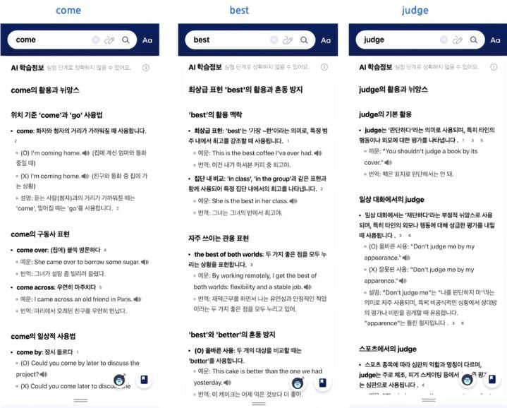 네이버는 어학사전 활용 방식도 단순 단어 뜻·예문 열람에서 AI 기반 개념 학습 중심으로 전환한다는 구상이다. 예를 들어 영어 단어 take처럼 의미 확장이 다양한 단어의 경우, AI가 활용 패턴과 숙어 표현, 빈출 구문 등을 요약해 제시함으로써 사용자가 맥락 중심으로 의미를 이해할 수 있도록 지원한다. 이는 전통적인 사전 조회 방식보다 학습 효율과 사용자 만족도를 높이는 방향으로 작동할 수 있다는 관측이 나온다.
