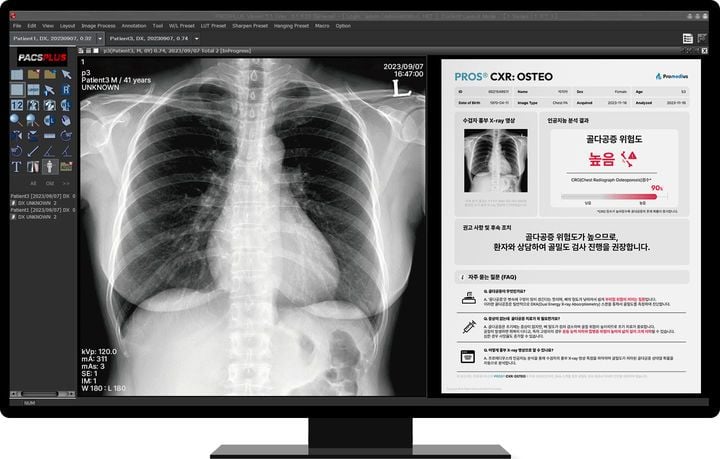 프로메디우스는 자사 골다공증 선별 AI 소프트웨어 오스테오 시그널이 평가 유예 신의료기술 대상 의료기기로 선정됐다고 23일 밝혔다. 오스테오 시그널은 흉부 엑스레이 영상에서 뼈의 구조와 밀도 패턴을 분석해 골다공증 위험도를 높음과 낮음 두 단계로 구분해 제시하는 소프트웨어형 의료기기다. 의료영상저장전송시스템에 연동돼 별도 검사 없이도 X선 데이터만으로 결과를 보여주는 것이 특징이다.