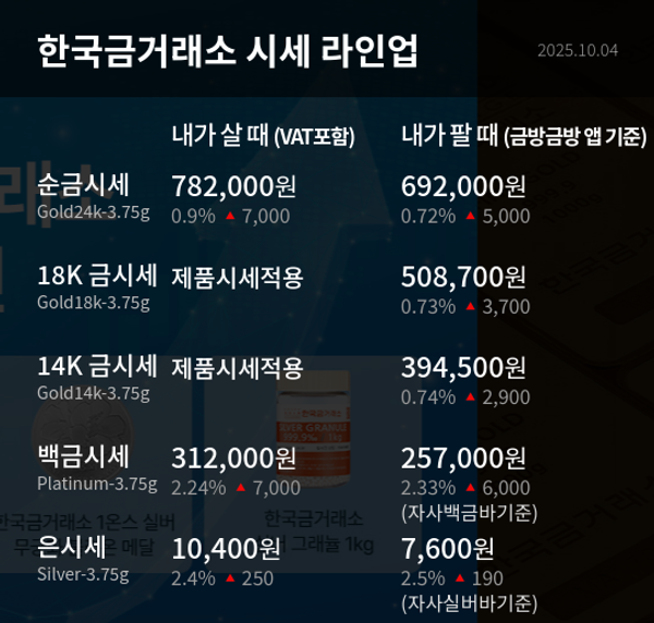 10월 4일 국내 귀금속 시세가 전 종목 상승 마감했다. 한국금거래소에 따르면 이날 24K 금 3.75g 매입가는 782,000원으로 전일보다 7,000원(0.9%) 올랐고, 판매가는 692,000원으로 5,000원(0.72%) 상승했다. 14K 금 판매 기준가는 394,500원으로 2,900원(0.74%) 올랐다.