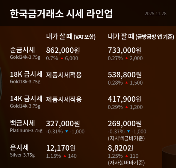 한국금거래소에 따르면 11월 28일 기준 24K 금시세는 3.75g 한돈 기준 내가 살 때 가격이 862,000원으로 집계됐다. 전일보다 6,000원, 상승률로는 0.7% 오른 수준이다. 내가 팔 때 가격은 733,000원으로 2,000원, 0.27% 상승해 금값 강세 흐름을 이어갔다.