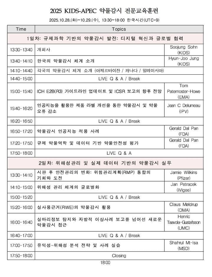 디지털 혁신기술이 아시아태평양 지역 의약품 안전관리 패러다임 전환을 예고하고 있다. 한국의약품안전관리원은 28~29일 이틀간 아시아태평양경제협력체(APEC) 회원국 공무원을 대상으로 ‘디지털 혁신기술과 데이터 기반 약물감시 발전’을 주제로 온라인 전문교육훈련을 실시간 진행한다. 이번 행사는 미국 식품의약국(FDA), 유럽의약품청(EMA), 세계보건기구(WHO) 산하 웁살라 모니터링센터 등 글로벌 약물감시 기관 전문가들이 직접 참여해, 인공지능(AI) 및 디지털 기술을 반영한 규제동향과 실무 경험을 공유하는 자리다. 업계는 인공지능 시대의 글로벌 약물감시 규제 역량 경쟁 심화의 분기점으로 바라본다.