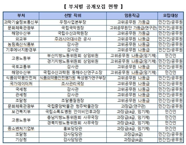 인사혁신처는 이날 “과학기술정보통신부 우정사업본부장, 문화체육관광부 국립국악원장 등 16개 부처 22개 직위를 개방형으로 모집한다”고 밝혔다. 이번 채용에는 실·국장급 15개와 과장급 7개 등 고위 간부직이 대거 포함됐다. 구체적으로 실·국장급에서는 과학기술정보통신부 우정사업본부장, 문화체육관광부 국립국악원장 외에도 해양수산부 국립수산과학원장, 외교부 주러시아대사관 공사, 농림축산식품부, 기후에너지환경부, 국토교통부, 국세청, 관세청의 감사관, 국가데이터처 조사관리국장 등 다양한 직위가 공모 대상에 올랐다. 과장급에서는 국립중앙박물관 청주박물관장, 국립소록도병원 안이비인후과장, 중소벤처기업부 홍보담당관 등이 포함됐다.