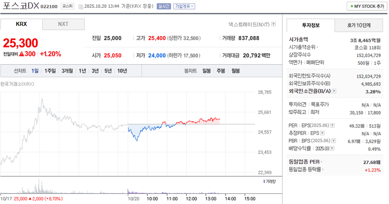 20일 오후 코스피 시장에서 포스코DX가 전일 대비 1.20% 상승세를 보이며 25,300원에 거래됐다. 네이버페이 증권 데이터(2025년 10월 20일 오후 1시 44분 기준)에 따르면, 포스코DX는 전일 종가 25,000원 대비 300원 오른 가격을 기록했다. 시초가는 25,050원으로 출발해 한때 24,000원까지 저점을 찍는 등 1,400원 폭의 변동성을 나타냈다.
