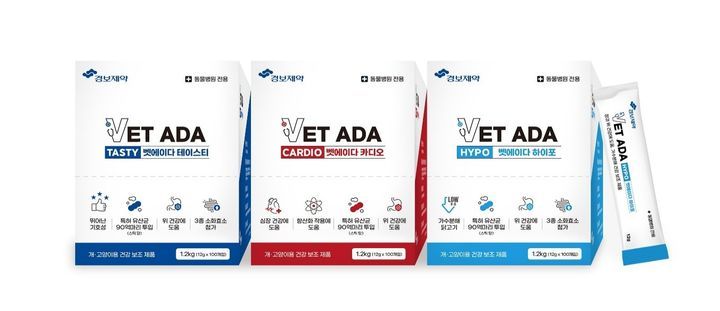 경보제약은 동물병원 전용 반려동물 투약 보조 및 건강 관리 제품 벳에이다 3종을 출시했다고 28일 밝혔다. 이번 신제품은 테이스티, 하이포, 카디오 등 세 가지 라인으로 구성됐으며, 2022년 선보인 벳에이다 플러스의 후속 라인업이다. 제형은 부드러운 습식 스틱포 12g 한 포 단위로 설계해, 정제나 캡슐에 비해 쉽게 먹일 수 있도록 했다. 스틱 1개에는 특허 유산균 90억마리와 함께 아밀라아제, 리파아제, 프로테아제 등 3대 소화효소가 포함돼 소화·흡수율 개선을 겨냥했다.