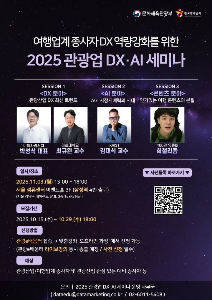 인공지능과 디지털 전환(DX) 기술이 관광 산업의 구조와 서비스 패러다임을 재편하고 있다. 문화체육관광부와 한국관광공사는 이 같은 변화에 맞춰 관광업계 종사자들의 AI 활용 능력을 키우기 위한 ‘관광업 DX·AI 세미나’를 11월 3일 서울에서 연다. 이번 행사는 디지털 경험, AI 기반 맞춤형 추천, 서비스 자동화 등 기술 혁신이 관광 시장에 미치는 구체적 영향을 조명하며 업계에 실질적 대응 전략을 제공하는 데 초점을 맞춘다.