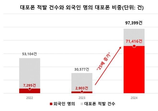 국내 체류 외국인 수는 2020년 203만명에서 2023년 265만명으로 꾸준히 늘고 있다. 후불 통신 상품 수요가 커지며 이통사 역시 외국인 대상 마케팅을 확대하는 상황이나, 내국인은 신분증 스캐너로 실물 확인을 거치는 반면 외국인은 여권 스캔만으로 개통이 이뤄져 서류 진위 검증이 사실상 어렵다. 이런 규제 공백이 대포폰 양산과 보이스피싱 범죄 확산의 온상이 된다는 게 국회 측의 분석이다. 2023년 기준 외국인 명의 대포폰 적발이 7만 건을 돌파했고, 올해 7월까지 보이스피싱 피해액만도 8000억원에 이른다. 연 환산 시 피해액은 1조3000억원을 상회할 전망이다.