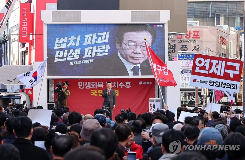 국민의힘은 22일 오후 부산 중구 광복중앙로에서 국민의힘 민생회복 법치수호 국민대회를 열고 이재명 정부를 겨냥한 대규모 장외 집회에 돌입했다. 당은 행사에 약 8천여 명이 참석했다고 추산했다. 집회 현장에는 사법 정의 재판 재개, 민생파괴 정권 레드카드 등 문구가 적힌 손팻말이 자리 잡으며 강경한 기조를 드러냈다.
