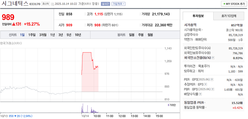 코스닥 상장사 시그네틱스가 10월 14일 오전, 이례적인 주가 급등세를 연출하며 관련 업계의 시선을 모으고 있다. 네이버페이 증권에 따르면 이날 오전 10시 23분 기준, 시그네틱스는 전날 종가(858원) 대비 15.27%(131원) 오른 989원에 거래되고 있다. 같은 시간 거래량은 2,117만주를 넘었고, 거래대금은 223억6,000만원에 달했다.
