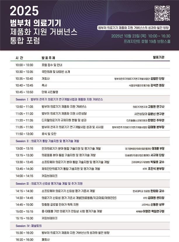 범부처 협력으로 추진되는 의료기기 규제과학 거버넌스가 산업에 새로운 제품화 전략을 제시하고 있다. 식품의약품안전처와 범부처 전주기 의료기기 연구개발사업단이 ‘2025 범부처 의료기기 제품화지원 거버넌스 통합포럼’을 서울 프레지던트호텔에서 개최한다. 이번 포럼은 각 기관의 협력 아래 의료기기 개발자와 연구자들을 대상으로 규제과학 기반의 혁신 지원 체계를 공유하고, 미래 발전 방안을 모색하는 자리로 마련됐다. 업계는 이번 포럼을 ‘의료기기 지원 체계 고도화의 분기점’으로 보고 있다.