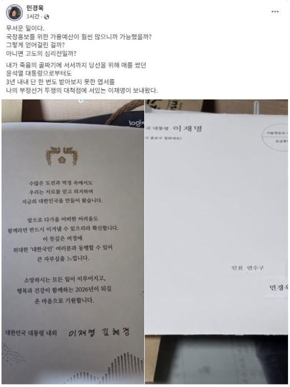 민 전 의원은 12월 31일 자신의 소셜미디어에 이재명 대통령 명의의 신년 연하장 사진을 올리고 “무서운 일”이라는 짧은 글과 함께 “국정 홍보를 위한 가용예산이 훨씬 많으니까 가능했을까, 아니면 고도의 심리전일까”라는 의문을 던졌다. 자신을 “부정선거 투쟁의 대척점에 서 있는 인물”로 규정해 온 만큼, 정치적 성향이 극단적으로 갈린 인사에게까지 연하장이 도달한 배경에 관심이 쏠렸다.