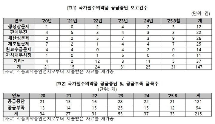 국회 보건복지위원회 소속 박희승 더불어민주당 의원실이 식품의약품안전처로부터 받은 자료를 기준으로, 국가필수의약품 공급중단 사유를 분석한 결과 채산성 저하, 제조원 이탈, 판매부진, 원료수급 차질 등이 중복적으로 작용한 것으로 집계됐다. 특히 147건 중 채산성 문제가 17.7%로 가장 큰 비중을 차지한 가운데, 제조원 문제(17.0%), 판매부진(15.0%), 원료수급 문제(9.5%) 등 시장·공급망 전반의 불안 요인이 누적되고 있다. 같은 기간 공급중단·공급부족 품목수 또한 215건에 달했다. 2023년 8월 기준 공급중단 품목은 21개, 공급부족 품목도 12개로 나와 연례적 재발이 확인됐다.