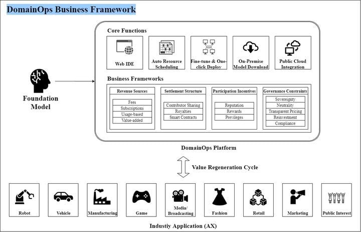 NC AI가 주도하는 독자 AI 파운데이션 모델 프로젝트는 그랜드 컨소시엄 구조를 따른다. NC AI가 공통 AI 기술과 파운데이션 모델을 제공하면, 컨소시엄 참여 기업들이 각자 산업 현장의 노하우와 양질의 데이터를 제공하는 방식이다. 도메인옵스는 이 협력 구조 안에서 데이터 제공자와 모델 개발자, 서비스 사업자 간 권리와 보상, 책임을 정의하는 운영 규칙 역할을 수행하도록 설계된다.