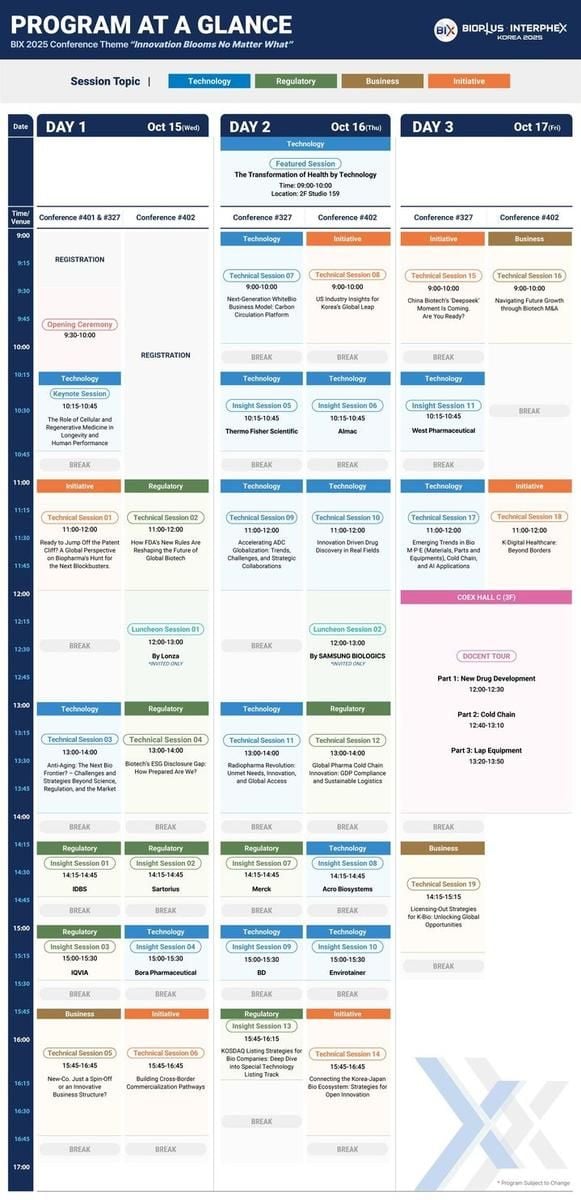 신기술과 기업 전략이 집결되는 국내 최대 바이오 행사 '바이오플러스-인터펙스 코리아 2025(BIX)'가 15일부터 3일간 서울 코엑스에서 열린다. 올해 행사는 한국바이오협회가 주최하는 가운데, 차세대 바이오의약품, 스마트랩, 글로벌 바이오 허브, 임상개발 혁신 등 산업 패러다임 변화를 선도하는 특별관이 마련됐다. 33개에 달하는 컨퍼런스 세션에서는 120여 명의 국내외 전문가가 세포치료, 화이트바이오, 콜드체인 등 다양한 분야의 기술 동향과 정책 방향을 집중 논의한다.