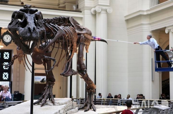 이번에 국내에 소개된 수는 공식 명칭 FMNH PR2081로, 1990년 미국 사우스다코타주에서 고생물학자 수 헨드릭슨이 발견했다. 통상 공룡 화석은 전체 골격의 20~30퍼센트만 확보돼도 학술적 가치가 높다고 평가되지만, 수는 부피 기준 약 90퍼센트 이상의 뼈가 보존된 보기 드문 표본이다. 생전 추정 몸길이는 약 12점3미터, 골반 높이는 4미터 수준으로, 현재까지 발견된 티라노사우루스 가운데 가장 크고 완전한 개체 중 하나로 꼽힌다. 전체 360여개 골격 중 250여개 이상이 확보돼 티라노사우루스의 표준 해부학 모델로 활용되고 있으며, 전신 골격 구조뿐 아니라 성장 연령, 질병, 부상 이력 등 생애사 연구의 핵심 데이터가 되고 있다.