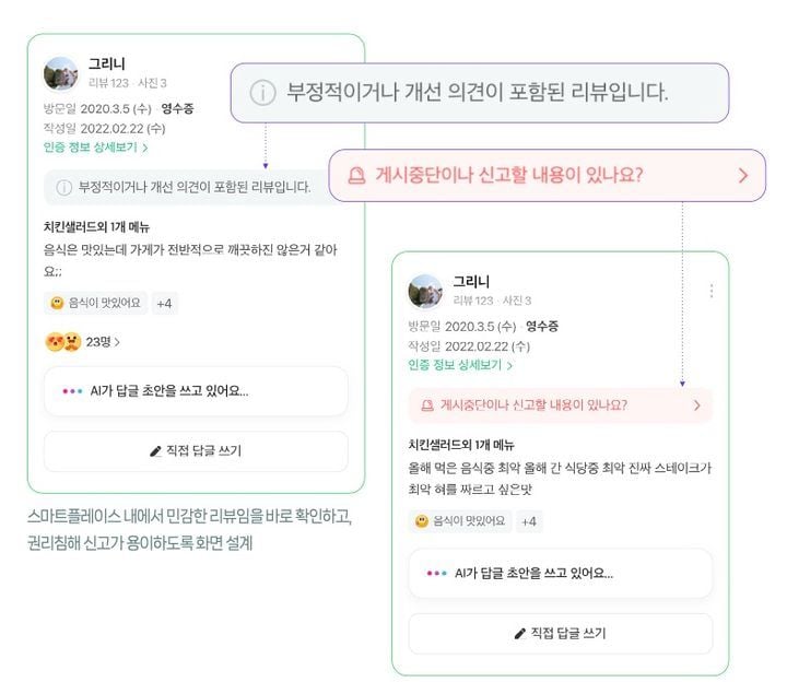 리포트에 따르면 네이버가 스마트플레이스를 통해 제공하는 리뷰 관리 솔루션은 고객 후기 게시 시 AI가 표현 수위와 문맥을 분석해 부정적이거나 민감한 이슈가 포함된 리뷰를 자동 선별한다. 감성 분석과 문맥 이해 모델을 결합해 욕설, 비방, 환불 분쟁 등 민감도가 높은 내용을 우선적으로 표시하고, 해당 리뷰가 올라오면 사업주에게 스마트플레이스 알림을 발송한다. 단순 키워드 필터링을 넘어 문장 구조와 상황 맥락을 함께 고려하도록 모델을 학습시킨 점이 특징으로 꼽힌다.