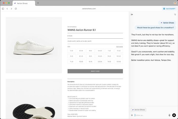 오픈AI의 챗GPT 아틀라스는 기존 브라우저 검색창 기능과 챗GPT의 인터페이스를 통합했다. 이용자는 웹페이지 주소를 입력해 일반 브라우저처럼 탐색할 수 있을 뿐 아니라, 챗GPT와 대화형으로 궁금한 점을 즉시 문의하거나, 현재 보고 있는 페이지의 주요 내용을 요약해 받아볼 수 있다. 더욱이 브라우저 내에 메모리를 적용해 과거 방문 기록이나 대화를 바탕으로 AI가 맞춤형 답변을 제공한다.