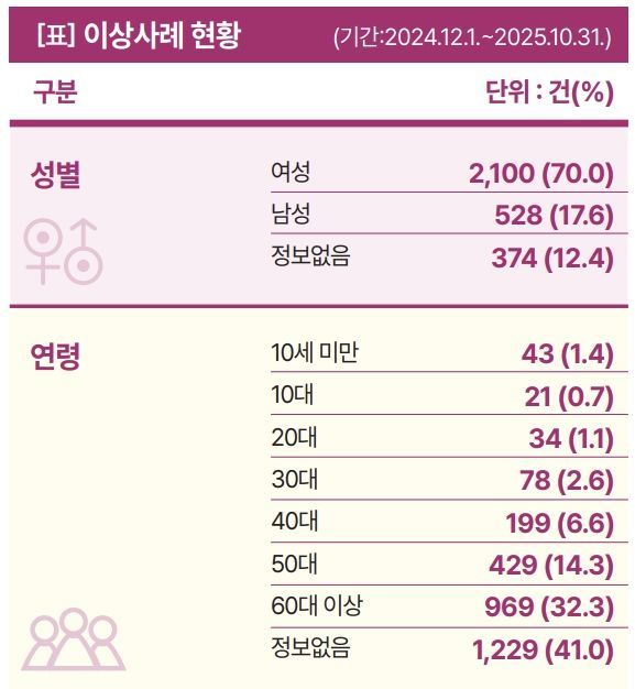 건강기능식품 이상사례는 2018년 이후 증가세가 이어지는 가운데, 지난해 한 해에만 2300여 건이 신고됐다. 이어 지난해 12월부터 올해 10월까지는 총 3002건이 접수됐다. 같은 기간 이상사례 발생자는 여성이 2100명으로 전체의 70퍼센트를 차지했고, 남성은 528명 17.6퍼센트, 정보 없음은 374명 12.4퍼센트로 집계됐다. 정보 확인이 가능한 연령대 가운데에서는 60대 이상이 32.3퍼센트로 가장 많았고, 50대 14.3퍼센트, 40대 6.6퍼센트, 30대 2.6퍼센트 순이었다. 건강기능식품의 주요 소비층이 여성과 고령층에 집중돼 있다는 시장 구조가 이상사례 통계에도 그대로 반영된 셈이다.