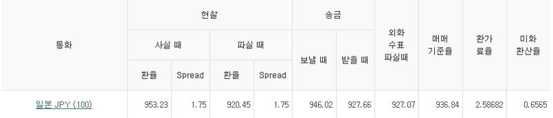엔화 환율이 소폭 하락했음에도 936원대를 유지하는 흐름을 보였다. 10월 14일 오전 8시 25분 기준 하나은행 고시환율에 따르면 일본 엔화 100엔당 원화 환율은 936.84원으로 집계됐다. 이는 전일 대비 0.28원(0.03%) 내린 값으로, 오전 중 한때 945.14원까지 상승했다가 점차 하락세로 방향을 틀며 안정된 모습을 나타냈다.