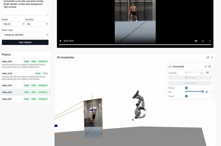 기존 로봇 개발 과정에서는 학습 데이터 확보 단계가 안전성 측면의 병목으로 지적돼 왔다. 장비 가격이 높고 사람과 로봇 모두에게 위험 부담이 큰 상황은 실험이 제한적일 수밖에 없었고, 테스트베드 역시 제한된 시나리오 위주로 운영되는 경우가 많았다. Video2Robot을 활용하면 사람이 수행한 실제 행동이나 가상으로 생성한 동작을 기반으로, 로봇이 넘어질 수 있는 상황과 회복 동작, 충돌 시 반응 패턴 등을 대량으로 만들어낼 수 있어 기존 한계를 상당 부분 보완할 수 있어 보인다.