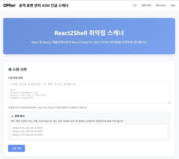 오펜 서비스를 사용하지 않는 기업이나 개발팀도 해당 취약점 노출 여부를 자체적으로 점검할 수 있도록, 엔키화이트햇은 리액트투쉘 전용 스캐너를 무상으로 외부에 배포했다. 사용자는 공격 표면 관리 ASM 긴급 스캐너 서비스에 접속한 뒤 스캔 버튼을 실행하는 것만으로도 취약점 존재 여부를 확인할 수 있도록 구성돼 있다. 회사 측은 이 도구가 안전 스캔 모드를 채택해 실제 서버에서 시스템 명령을 실행하지 않고도 취약 가능성을 판별하는 방식을 사용해, 운영 중인 서비스에 부하나 장애를 최소화한다고 설명했다.