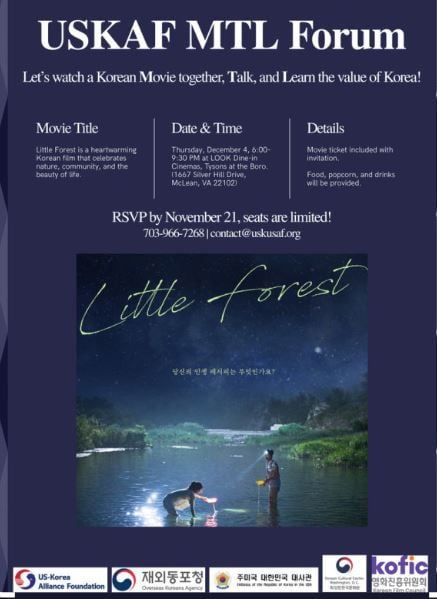 미주한미동맹재단은 12월 4일 미국 버지니아주 타이슨스에 위치한 룩 다인-인 시네마에서 MTL(Movie together Talk and Learn) 영화 포럼을 개최한다고 1일 전했다. 이번 행사는 재외동포청, 주미대한민국대사관, 영화진흥위원회가 후원하고 워싱턴 한국문화원이 공동으로 주최해 공공기관과 민간재단이 함께 꾸리는 한미 문화 행사로 진행된다.