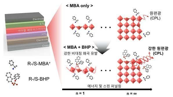 울산과학기술원 신소재공학과 송명훈·이승걸 교수팀은 페로브스카이트 발광층 내부에 특수 키랄 분자 두 종을 동시에 도입해, 외부 편광필터 없이도 고순도의 원형편광을 선택적으로 방출하는 페로브스카이트 LED를 개발했다고 29일 밝혔다. 연구 결과는 12월 3일 국제학술지 어드밴스드 펑셔널 머터리얼즈 온라인판에 게재됐으며 정식 출판을 앞두고 있다.