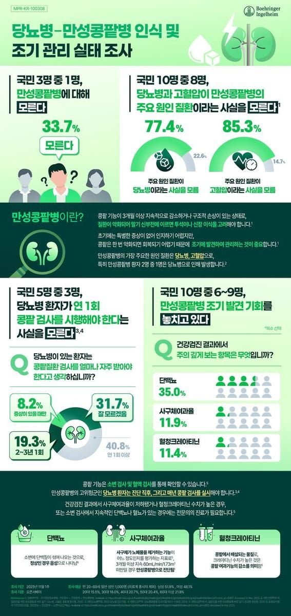 한국베링거인겔하임은 8일 당뇨병과 만성콩팥병의 연관성과 조기 관리 필요성에 대한 인식 수준을 분석한 당뇨병 만성콩팥병 인식 및 조기 관리 실태 조사 인포그래픽을 공개했다. 이번 조사는 회사가 진행 중인 당장 캠페인의 일환으로, 전국 만 20세에서 69세 일반 성인 1000명을 대상으로 지난달 1주일 동안 온라인 설문 플랫폼을 통해 실시됐다.